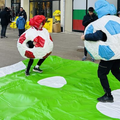 Подходящо за малки и големи, с нашия атракцион „футболно сумо“ забавлението е гарантирано. Участниците се превръщат в гигантски футболни топки като целта им е да съборят или да избутат от тепиха противника си. Тепихът наподобява футболен терен, което прави играта още по атрактивна. Време е да се забавлявате като никога досега! С нашите футболни сумо костюми смехът и доброто настроение са гарантирани.