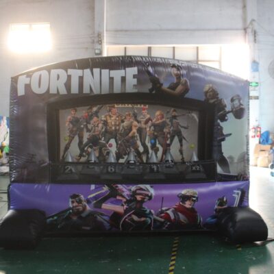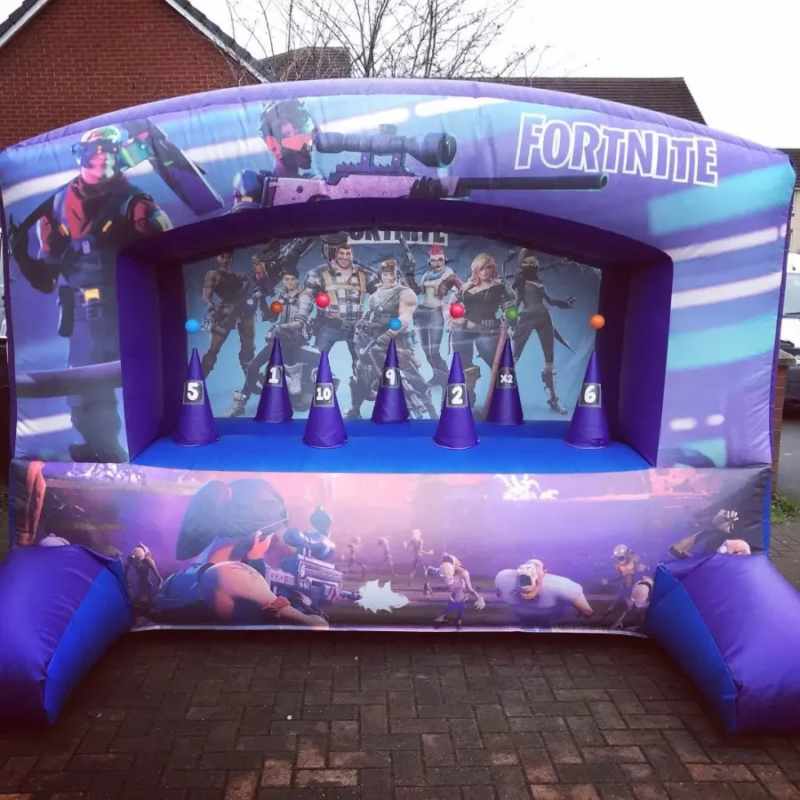 Нашата надуваема Fortnite атракция комбинира визуалната магия на любимата игра с реална активност и състезание. Участниците целят топки върху конусни мишени, всяка с различна стойност – от 1 до 11 точки и множители. Оръжията са nerf и това прави играта още по интересна. Посочената цена е за наем от три часа.